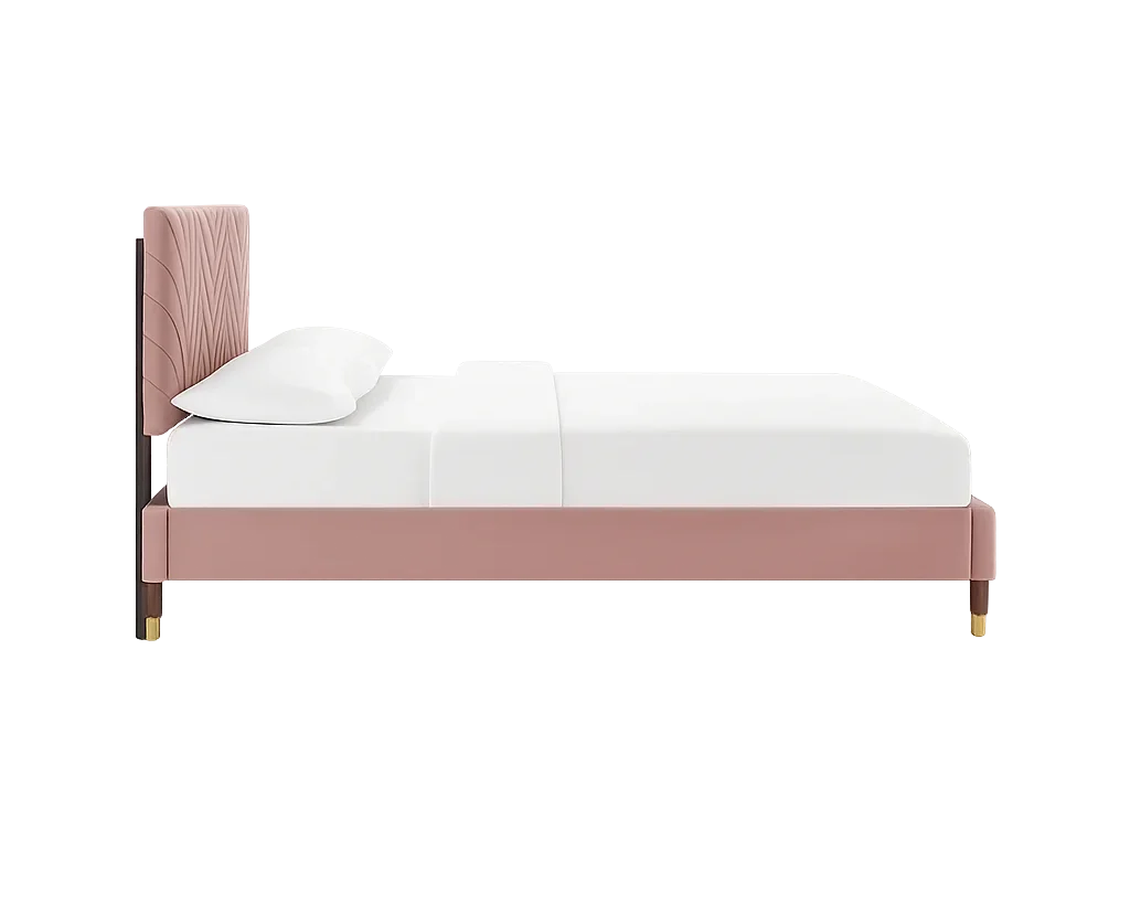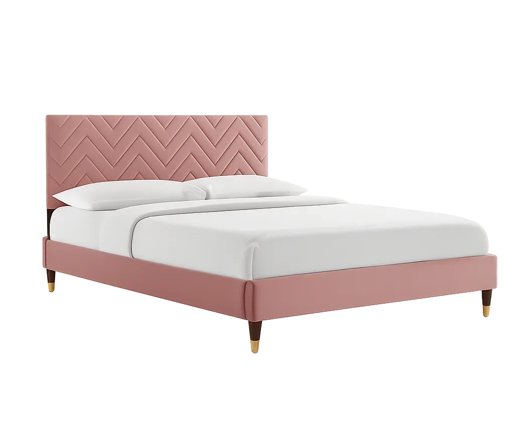 The Leah Velvet Bed combines luxury, comfort, and contemporary design for your bedroom. Upholstered in soft pink velvet, the chevron tufted headboard adds elegance and style to any bedroom setting, creating a cozy and inviting atmosphere.
