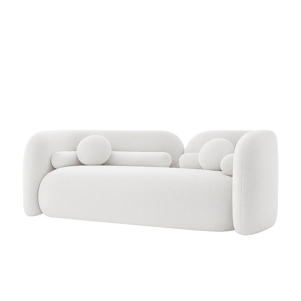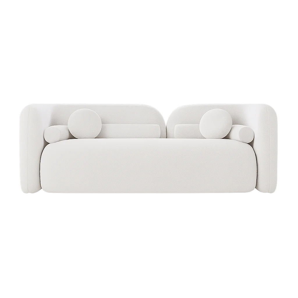 Wrapped in premium boucle fabric, Melva brings tactile warmth and contemporary elegance to any room. The soft firmness offers a deep, plush seating experience that feels like a gentle hug, enhanced by its rounded armrests and playful bolster cushions.