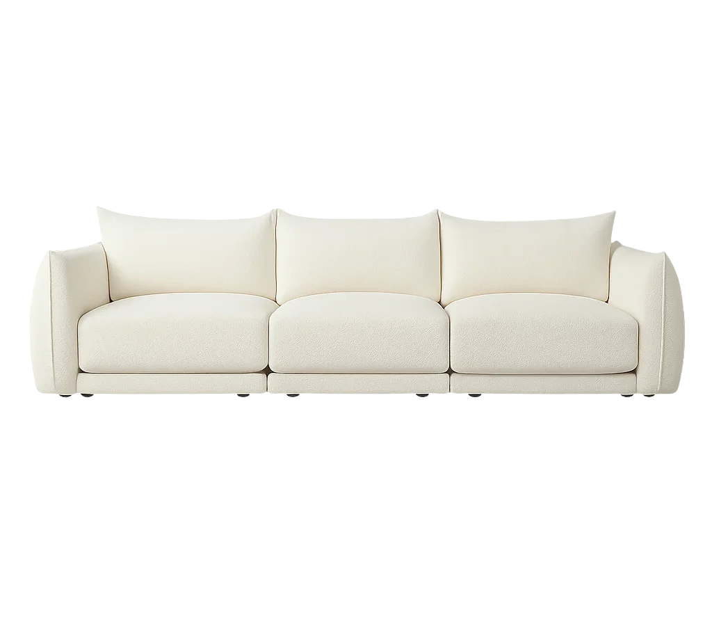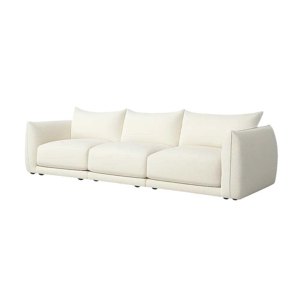 Crafted in pure white fabric, the Jules Sofa instantly brightens any living space with its clean, modern aesthetic. Its minimalist design allows endless styling options: keep it sleek and neutral, or add colorful bohemian cushions and a throw blanket to create a casual, welcoming vibe.